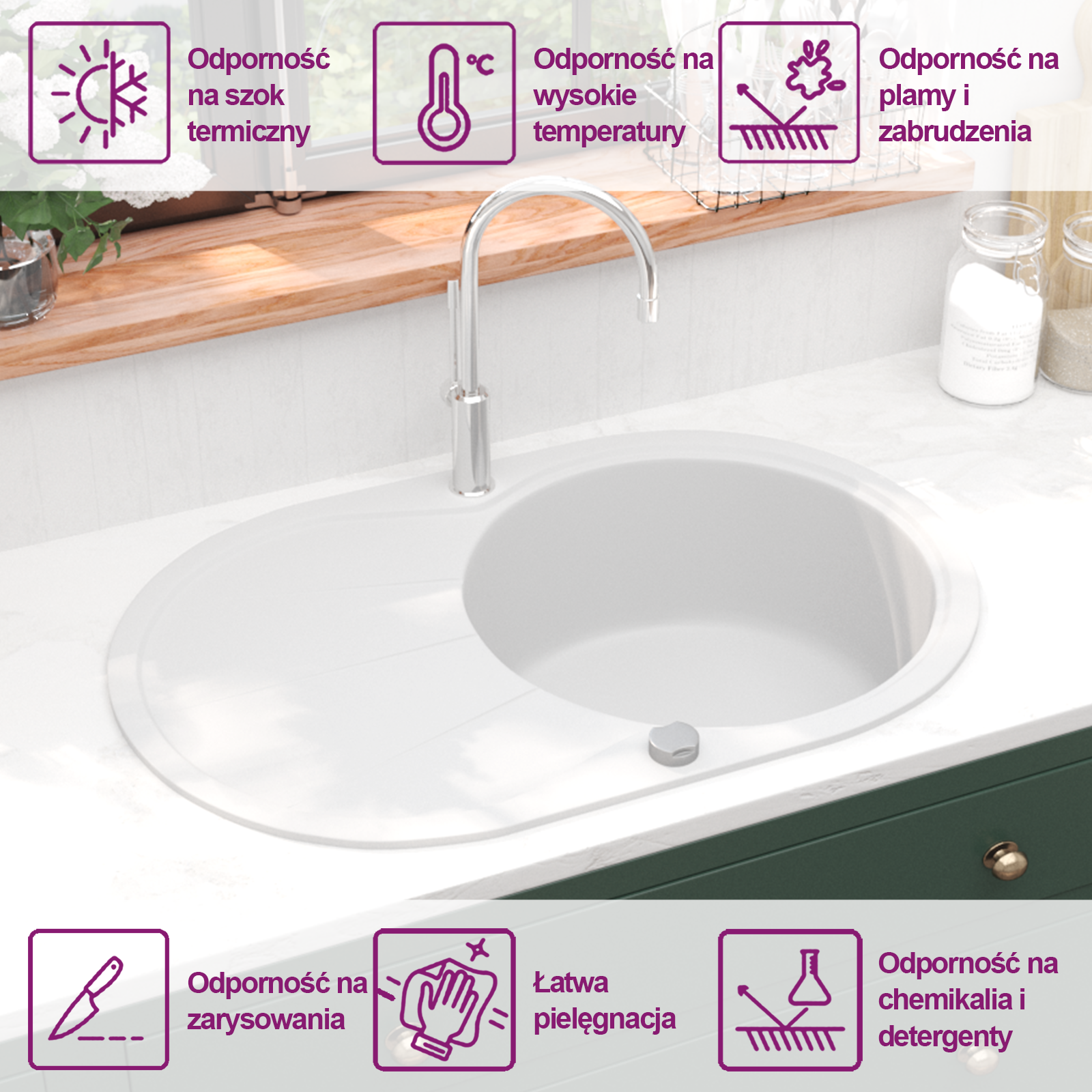 Wysokiej jakości granit sprawia, że zlew jest wyjątkowo odporny na ciepło, zarysowania i uderzenia, a także łatwy w czyszczeniu. Dodatkowo jest odwracalny, co oznacza, że można go zamontować po prawej lub lewej stronie. W zestawie znajduje się również sitko, ułatwiające usuwanie resztek.
