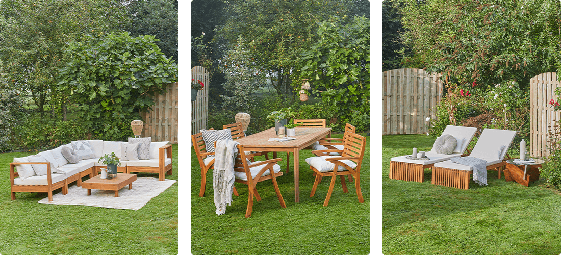 Słoje i tekstura wybranego drewna wnoszą naturalny urok do Twojego przytulnego ogrodu. Upewnij się, że chronisz meble przed warunkami atmosferycznymi, przechowując w odpowiednim miejscu lub używając pokrwców. Aby wyglądały jak nowe, zaleca się regularne olejowanie lub woskowanie.